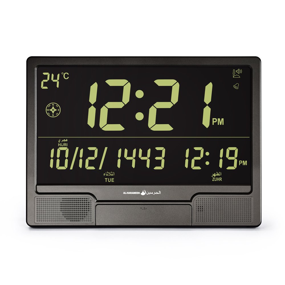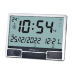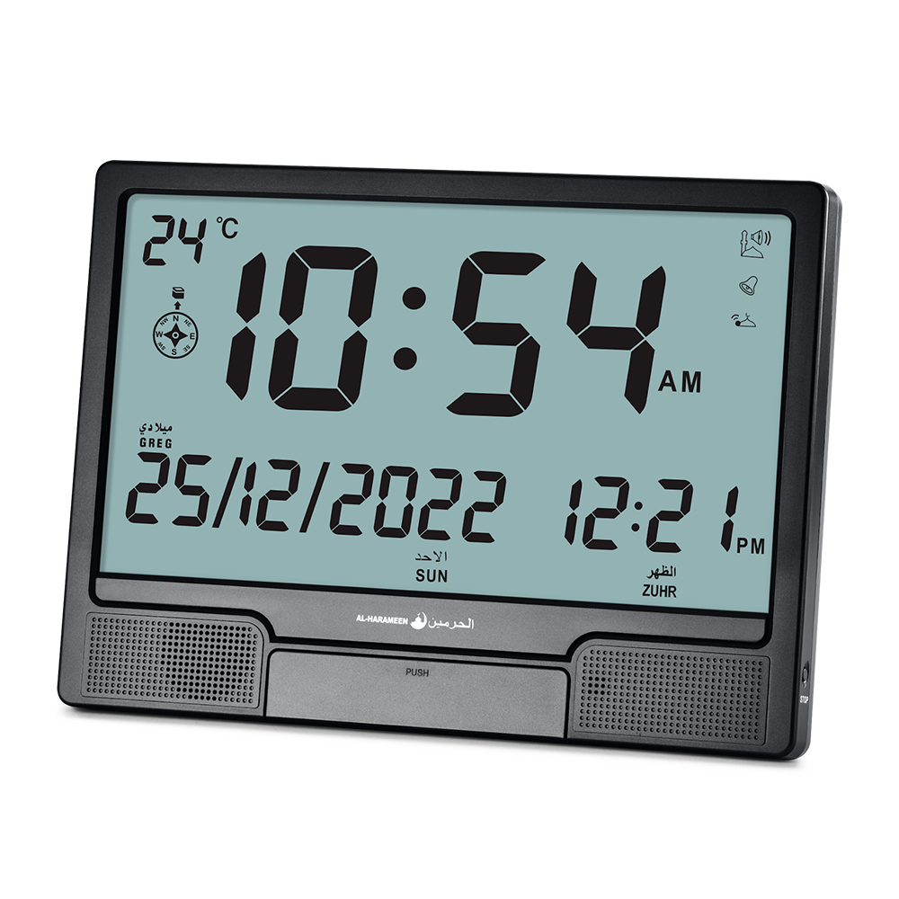 - ساعة الحرمين HA.4001 مكتبية وحائطية، تعمل بعقارب رقمية مع أذان كامل للصلوات الخمس ومنبه لكل صلاة. مناسبة للبيت والمكتب والمساجد.